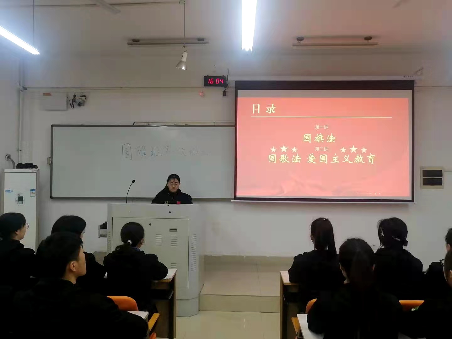 11月15日,为进一步增强国旗班第28届成员的爱国护旗意识,国旗班举行宣讲国旗法、国歌法及爱国主义教育主题班会,增强国旗班成员的民族自豪感和爱国主义精神。