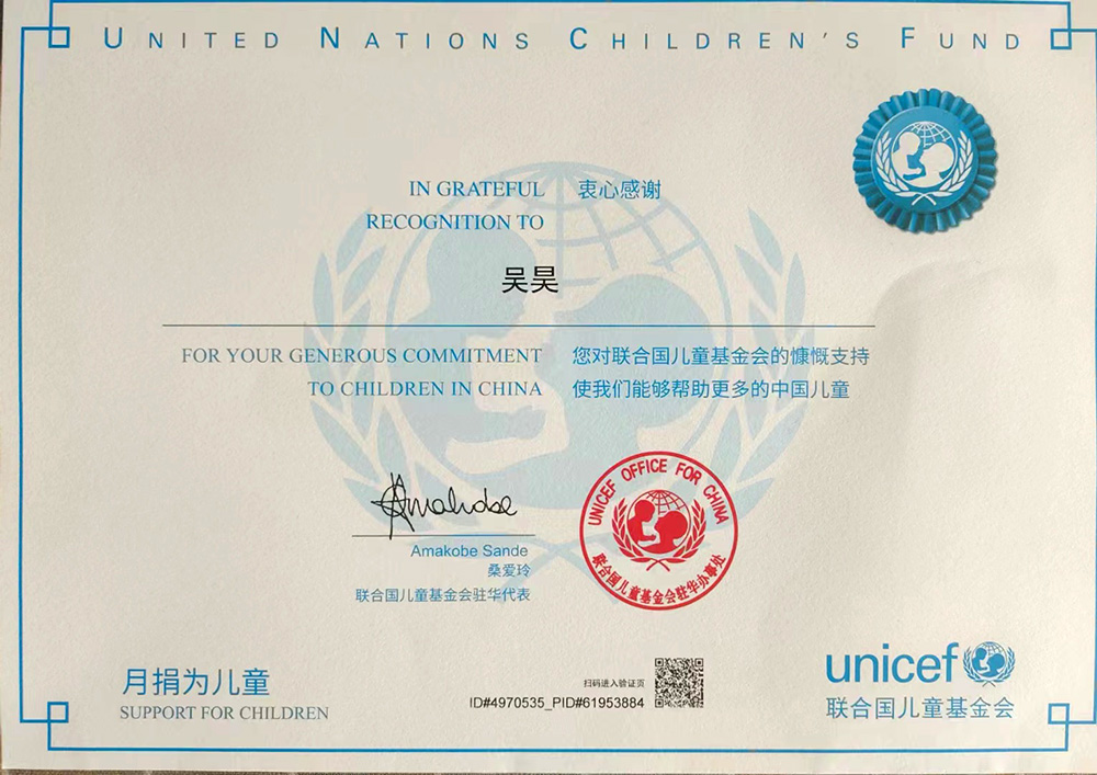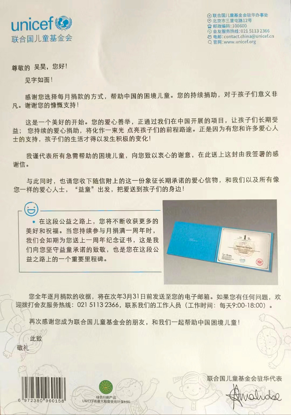 “尊敬的吴昊,您好!感谢您选择每月捐款的方式,帮助中国的困境儿童。您的持续捐助,对于孩子们意义非凡。”这封以联合国儿童基金会驻华代表名义发来的信和证书,是对伟德国际1949始于英国刑事司法学院的吴昊同学自发持续爱心捐助的肯定。
