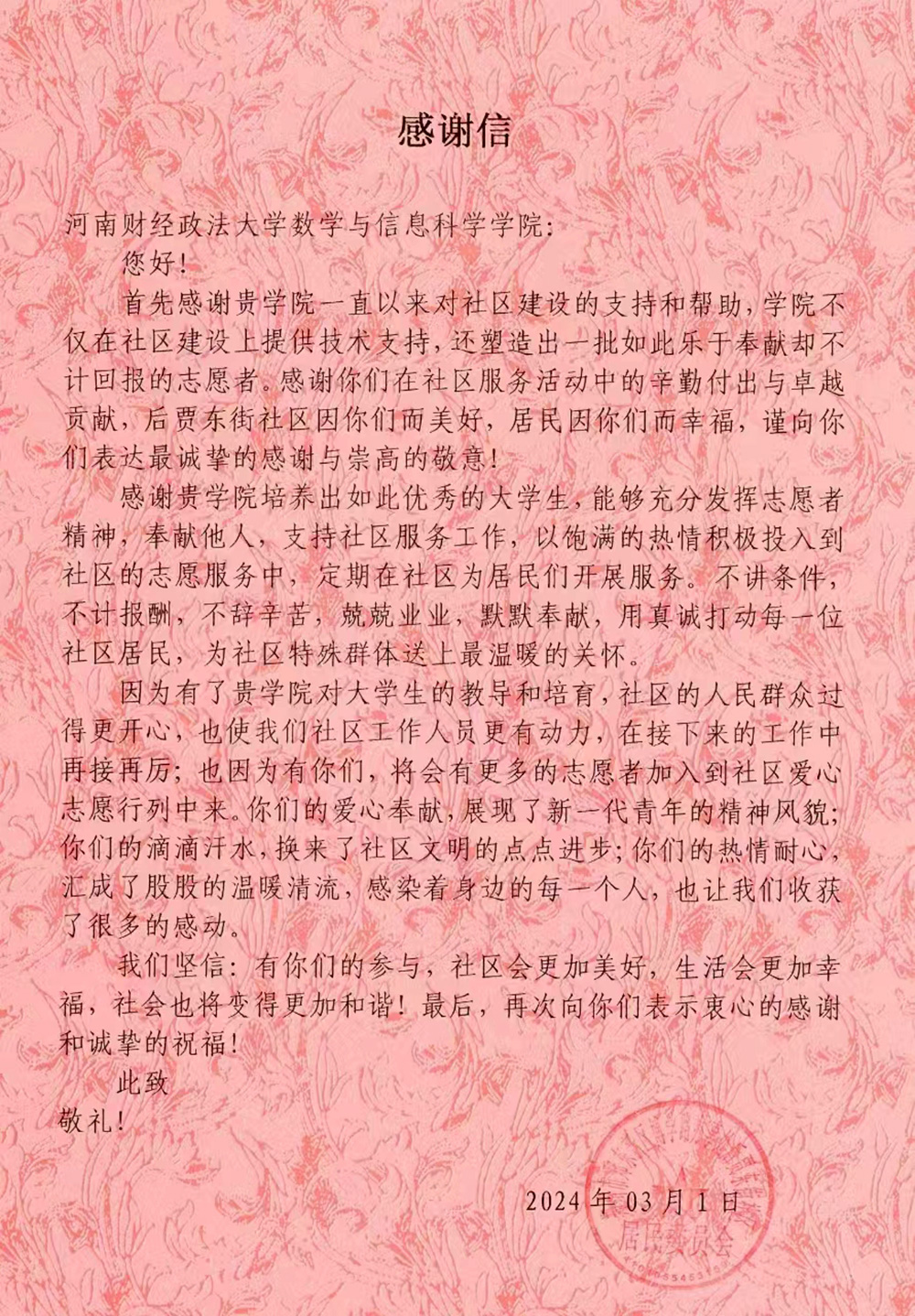 近日,后贾东街社区向数学与信息科学学院赠送“志愿服务暖人心,助力社区践初心”锦旗和感谢信,向长期积极参与社区志愿服务的师生们表示感谢。