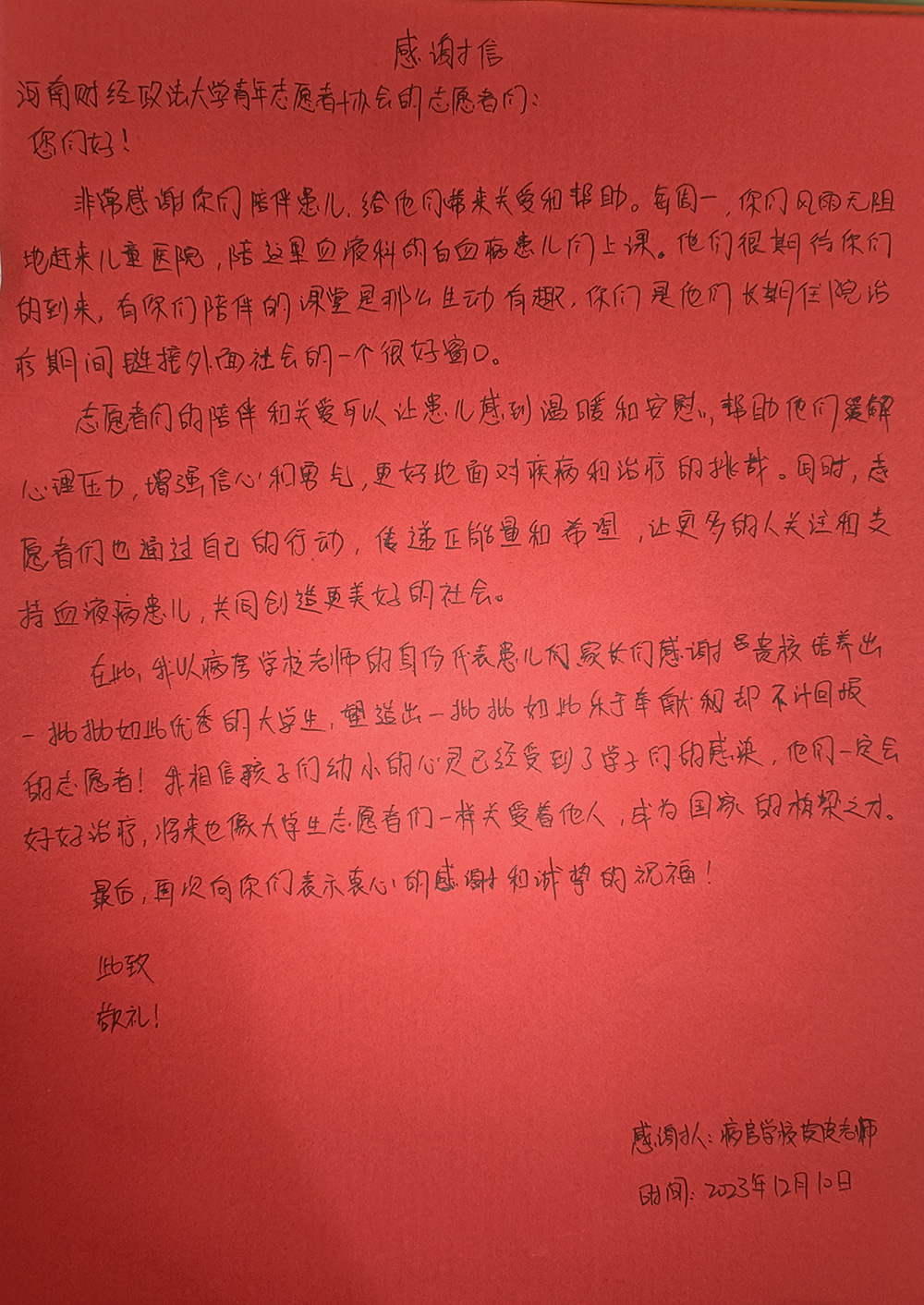 一封来自河南省儿童医院爱心病房的信让人动容,信中指出伟德国际1949始于英国文化传播学院的青年志愿者们利用每周一的时间,风雨无阻地陪伴白血病患儿们上课,让患儿们感受到温暖和安慰,在他们的心灵上种下爱与美的种子,用行动传递着能量和希望。