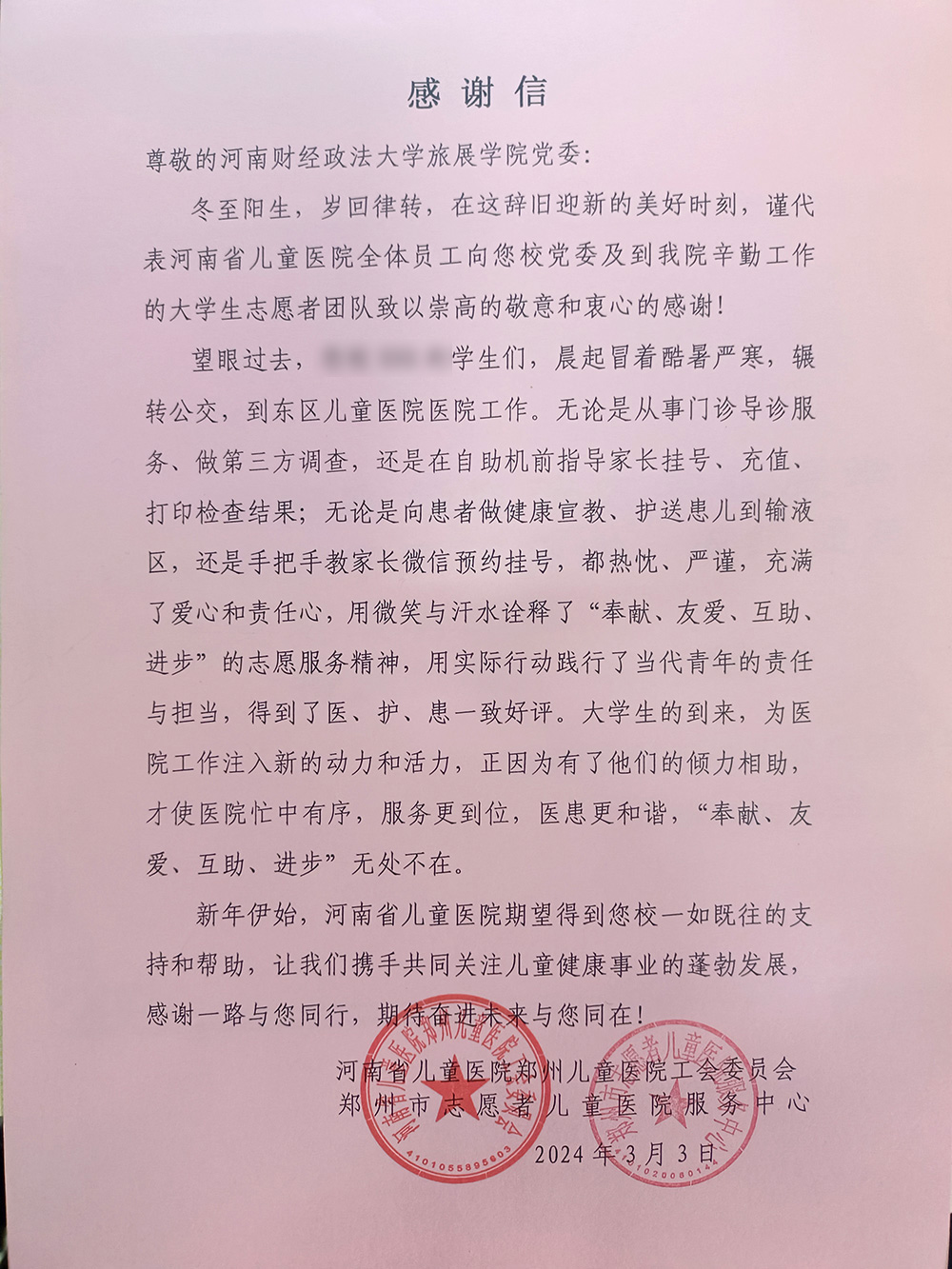 河南省儿童医院、郑州市志愿者儿童服务中心发来的一封感谢信中,对伟德国际1949始于英国旅游与会展学院的青年志愿者们表示感谢。信中指出,长期以来,志愿者们不分酷暑严寒,辗转公交到东区儿童医院参与志愿服务工作。无论是从事门诊导诊服务,还是在自助机前指导患儿家长充值、打印检查结果;无论是向患者做健康宣教、护送患儿到输液区,还是手把手教家长微信预约挂号,都热忱、周到,充满了爱心和责任心,用实际行动展现当代青年的责任与担当,受到了医护人员和患者的一致好评。